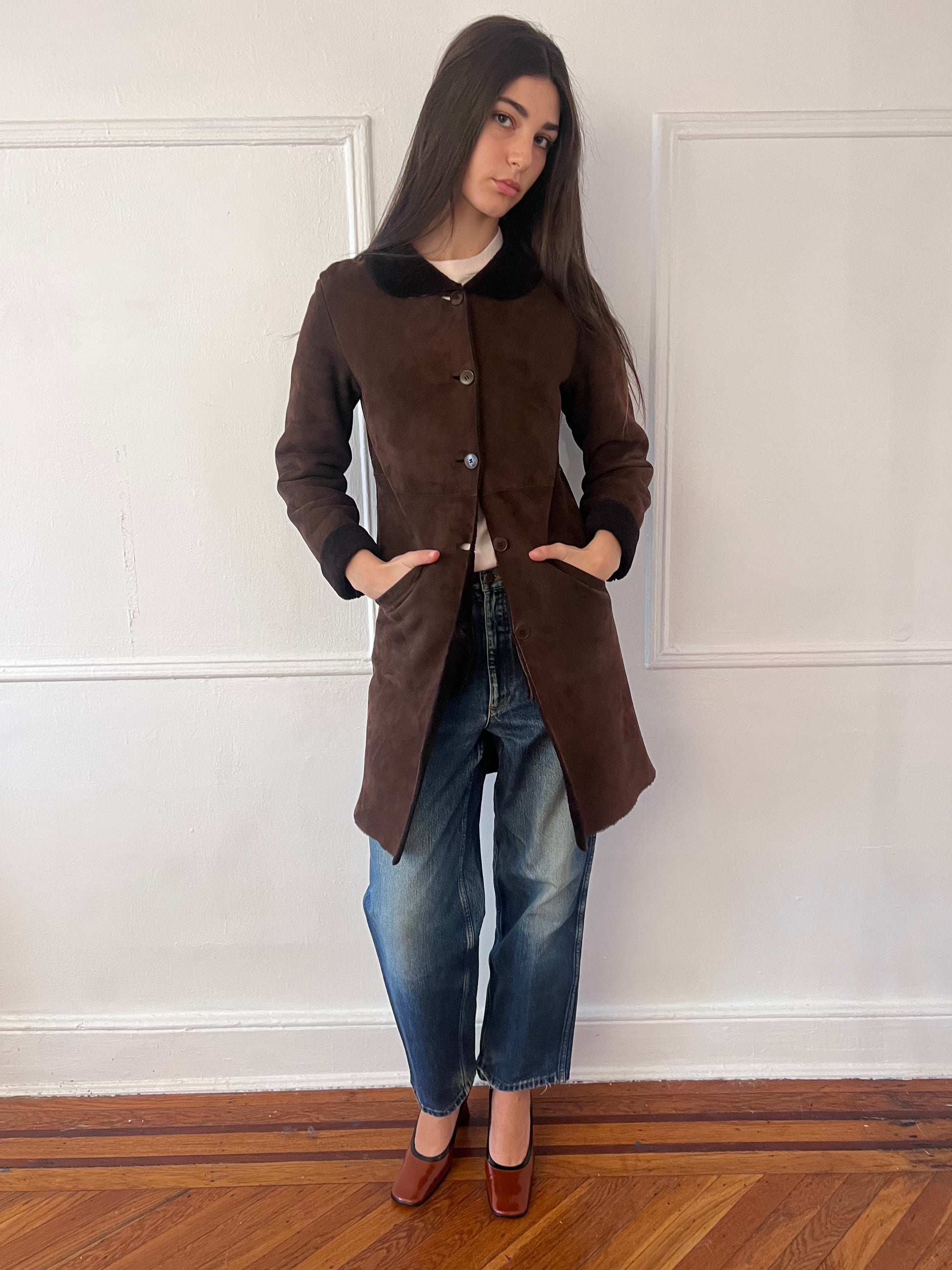 Absolutely stunning, the softest brown sheepskin coat with an adorable peter pan collar.