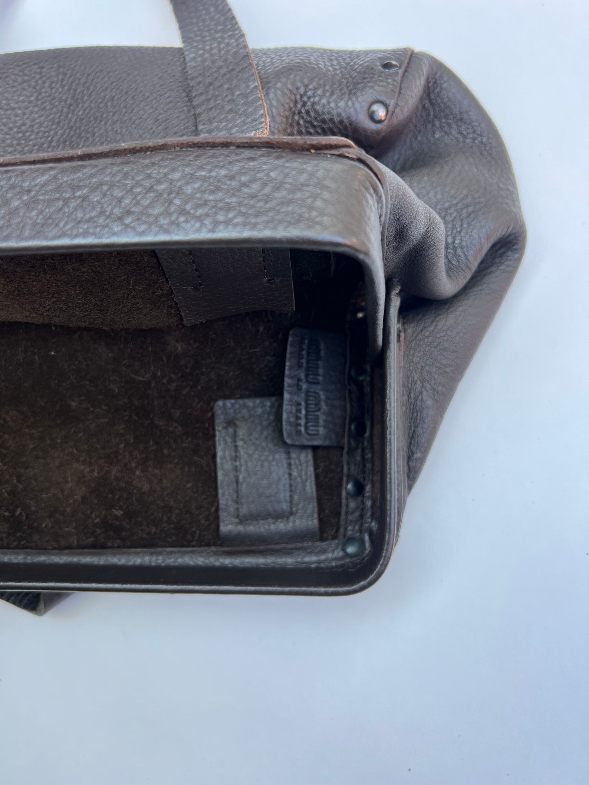 Miu Miu studded pebble leather bag with a brown suede inside.
